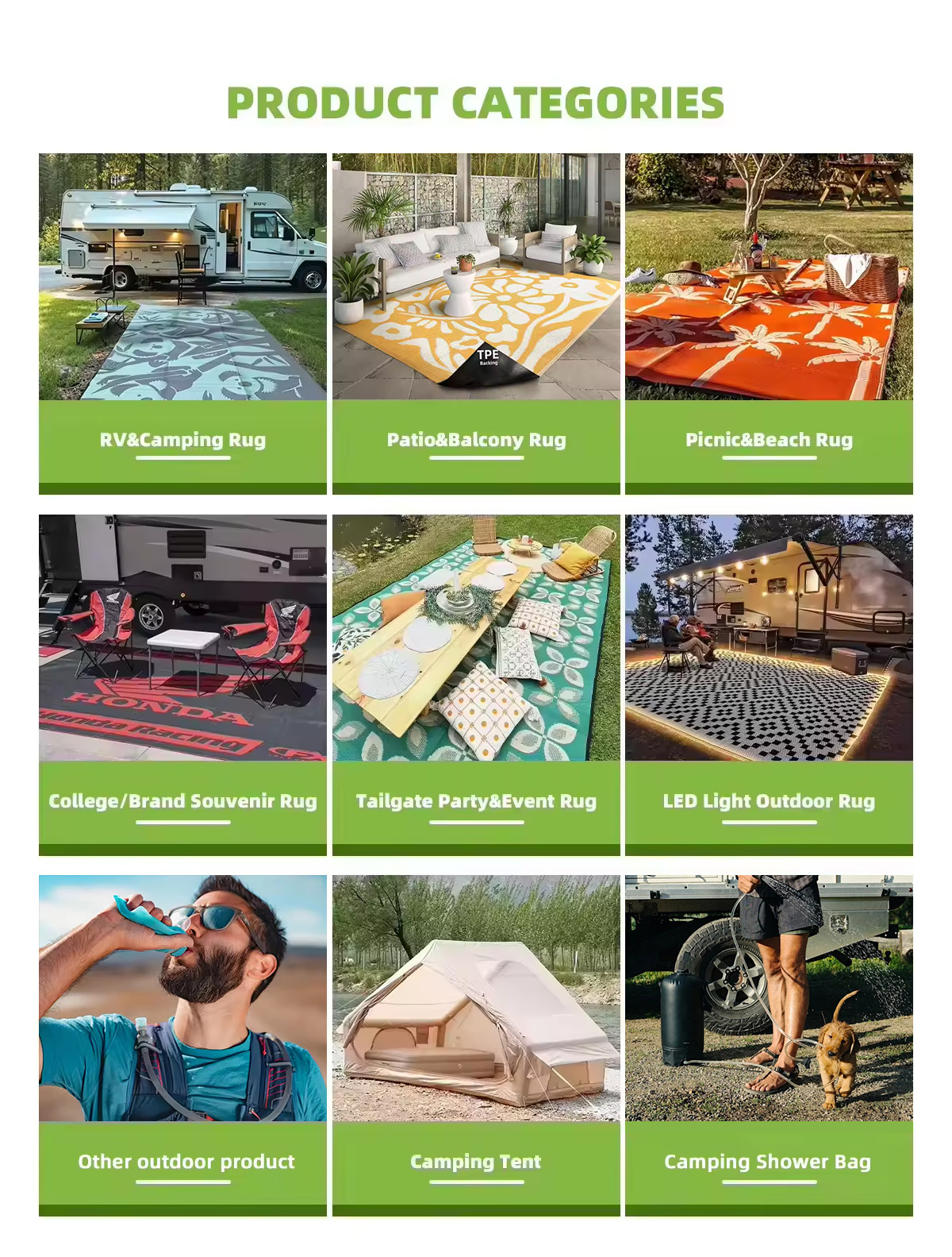 제조업체 야외 매트 사용자 정의 pp 재료 내구성 청소하기 쉬운 뒤집을 수있는 야외 러그 rv 캠핑 야외 짠 카펫